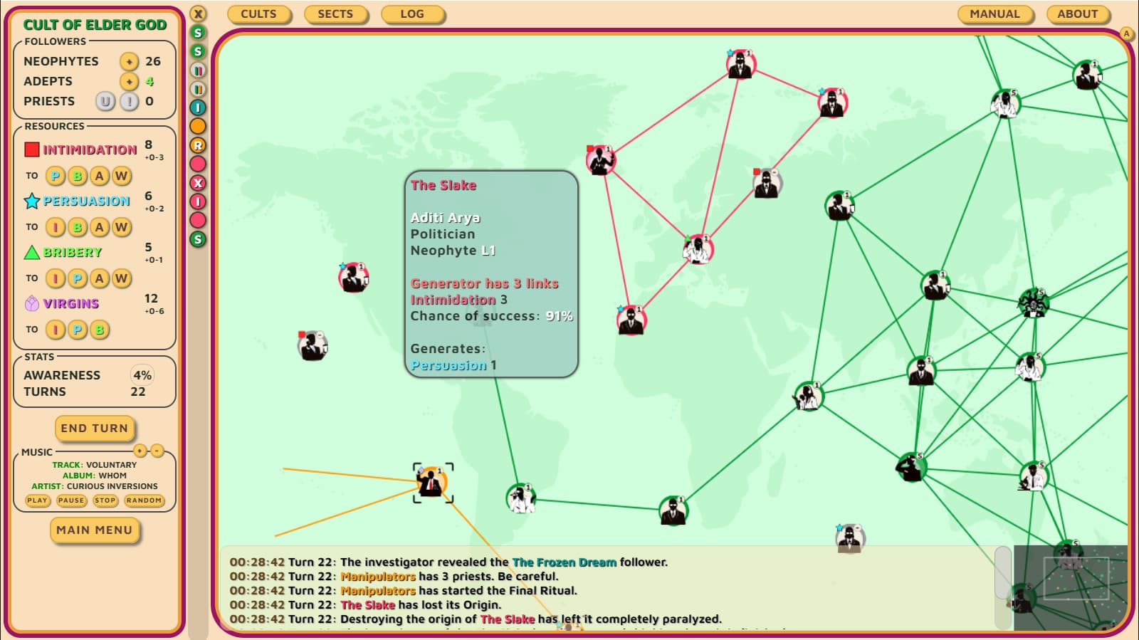 Evil Cult is a turn-based strategy game about various sinister cults all vying for world domination. Whether through completing the Final Ritual or eliminating all opponents, the victory will not be easy. Managing a cult is a tricky job, you see. Pesky investigators, multiple offspring sects, bloodthirsty opponent cults, these are all threats that have to be dealt with or successfully evaded. And all that has to be done below the radar of the human society.This version of the game was upgraded with a modern UI look and interface. However, the classic minimalistic black design is fully supported, too. Various long-standing bugs in the classic version were fixed and all gameplay features were backported to coincide with the 10th anniversary of the release of the first public version.Features include:Artifacts of the Arcane Expansion - Use mysterious occult artifacts to enhance the base game.Multiplayer - Shared screen multiplayer is available. Join your friends or play against them.Custom Game - Tired of playing the base game? Start a fully custom one. Each of the gameplay variables is open for tweaking around in this mode.Four hours of music - An incredible electronica soundtrack by Jeremy Rice of Curious Inversions and Introspective fame, known by the fans of the original game.Classic Mode - Full classic mode graphics and UI included. Relive the nostalgia.Investigators - These irritating investigators never cease to vex the cults, bringing the additional challenge.Sects Management - Using manual micromanagement or an AI advisor, these, erm, devoted groups of unsuspecting people will help you reach your nefarious goals.
