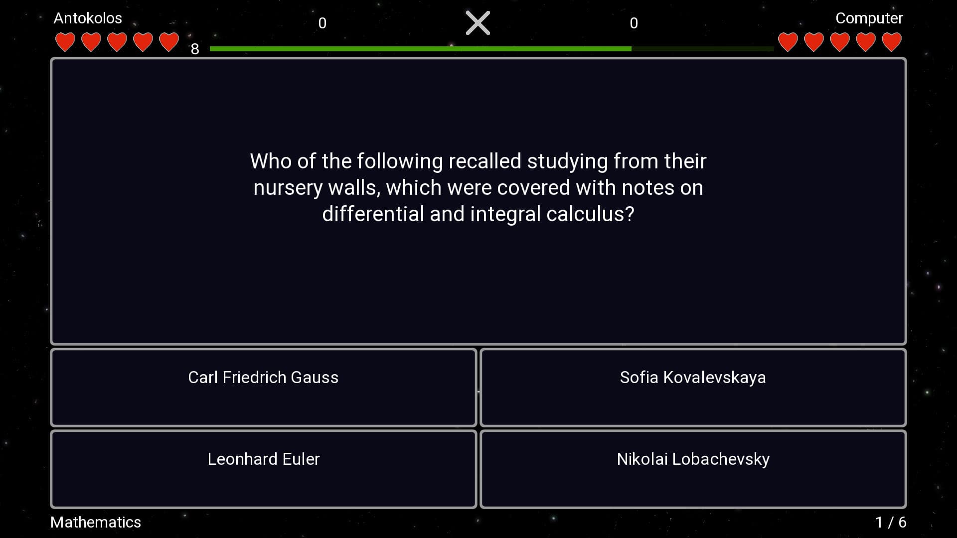 In the fascinating quiz “I Know Everything” you can play against a computer player or a friend. You can test your erudition and will probably learn many interesting things from various fields, including mathematics, literature, cuisine, and astronomy.