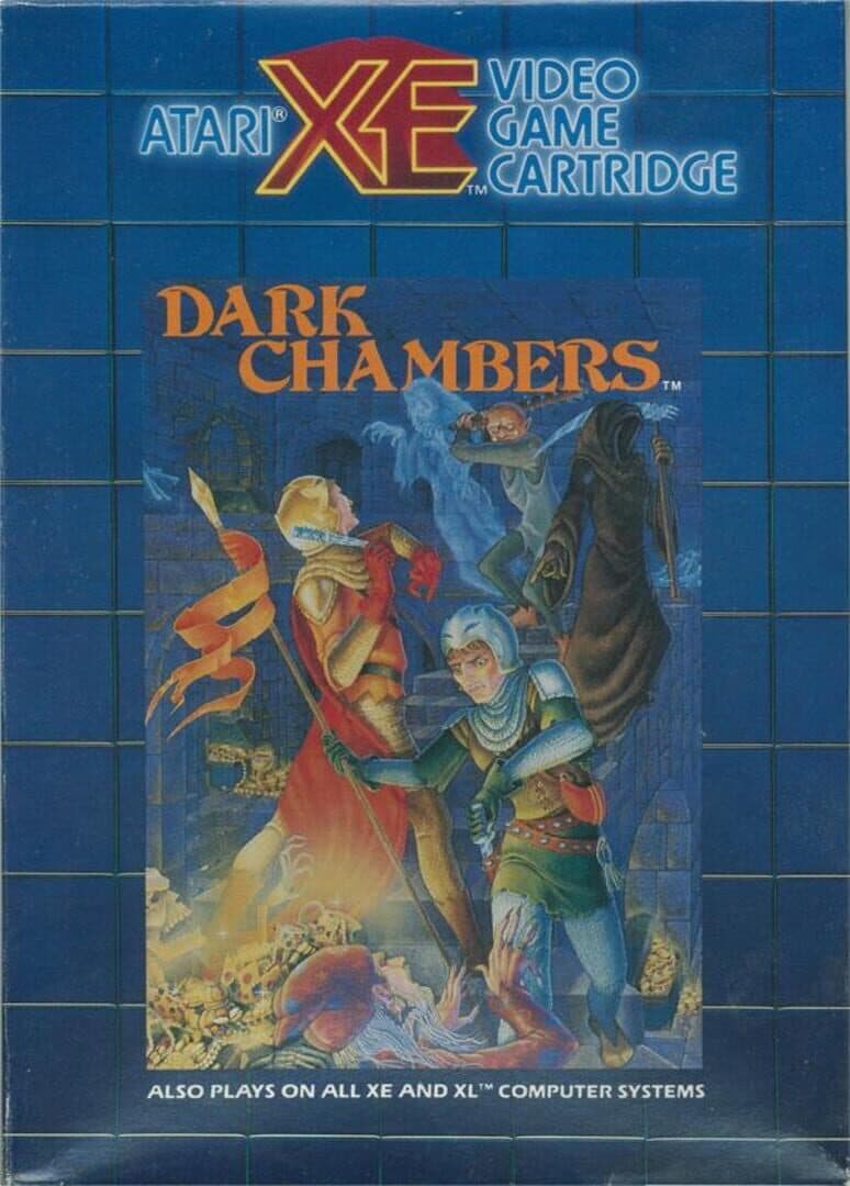 Dark Chambers is an arcade action game similar to Gauntlet. You are an explorer in an underground maze; your goal is to survive the 26 different levels and collect as many of the hidden treasures as you can. Hidden somewhere in each of the levels is an exit which will take you on to the next level. Trying to stop you from completing your quest are a wide variety of creatures, including zombies, wraiths, skeletons, wizards, and the grim reaper. Each of the creatures in the game has a different strength; when you shoot a creature, it will transform into the next weaker creature. Eventually a creature will become the weakest one (a zombie) at which point it can be destroyed. In addition to the creatures and treasures, other items that can be found in the maze are keys (to open doors), potions (to restore health), poison (drains health), guns (increases your firing rate), traps, shields, and bombs. The game is played from an overhead point of view, and is for one player or two players simultaneously.