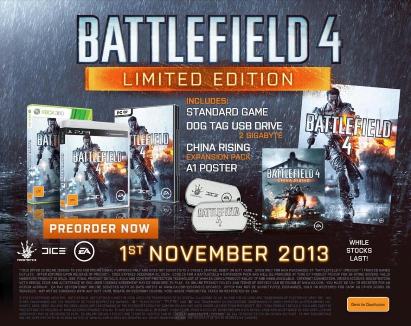 Battlefield 4: Limited Edition includes: - Standard Game - "Dog Tag" USB drive - "China Rising" Expansion pack - A1 Poster