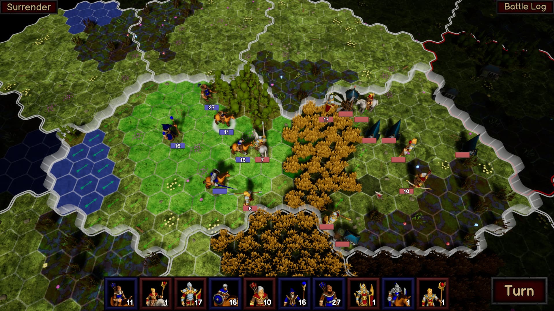 - Turn-based combat takes place between two sectors at the world map. Terrain and buildings affect combat.