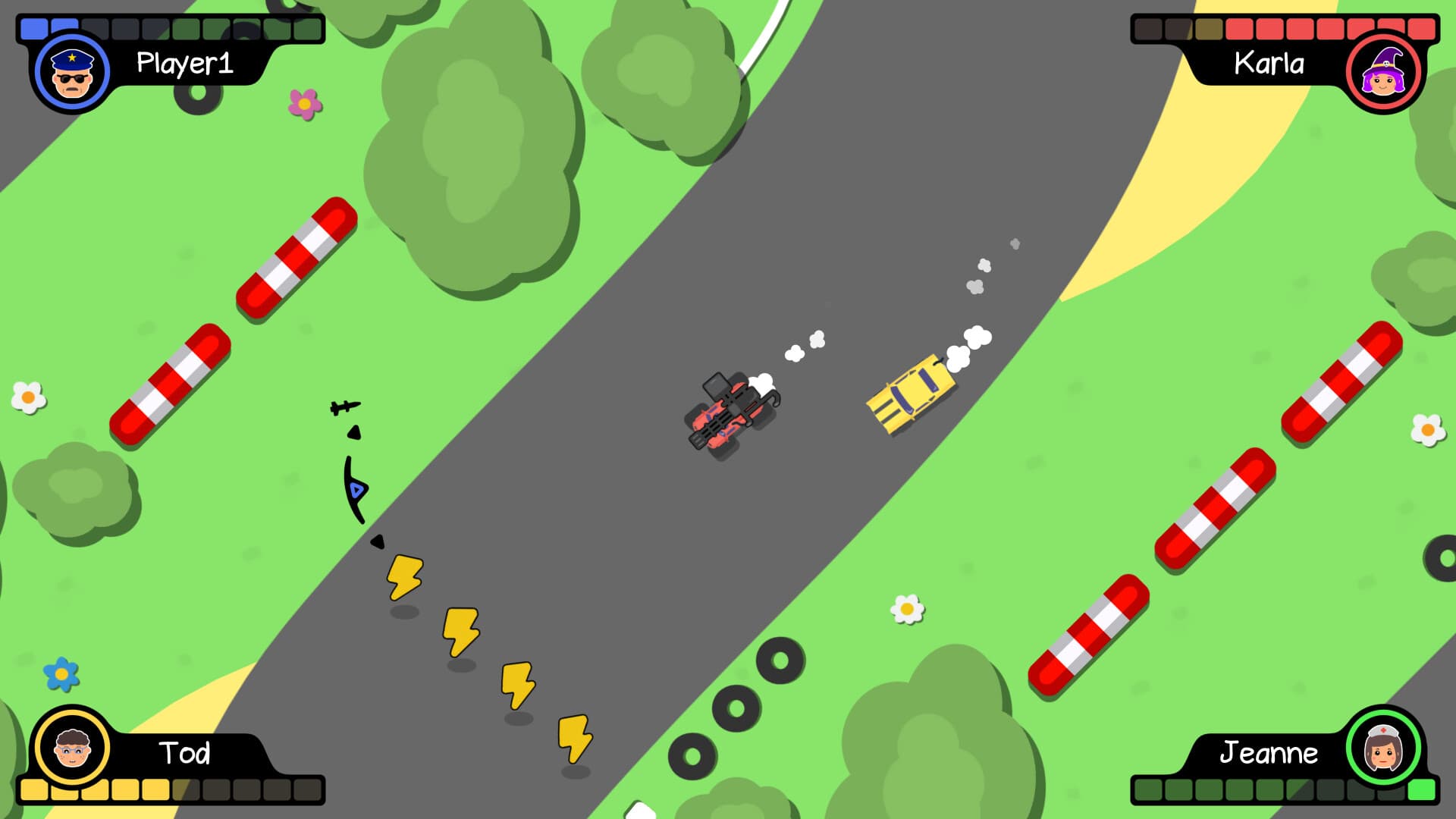 - Physical objects, bonuses and other interactions (turbo, oil puddle, frogs...)
