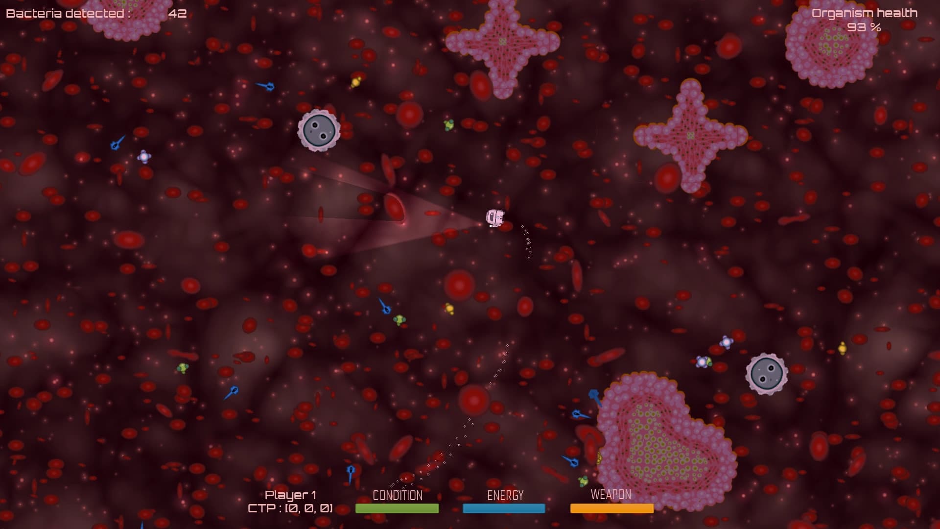 Pilot your nanobot to defy the bloodstream, the gravity and the physics, unlock new weapons and capabilities from special hormones captured along the way. Fight the various bacteria and menacing virus with a classic gameplay mechanic and save your organism from infection.