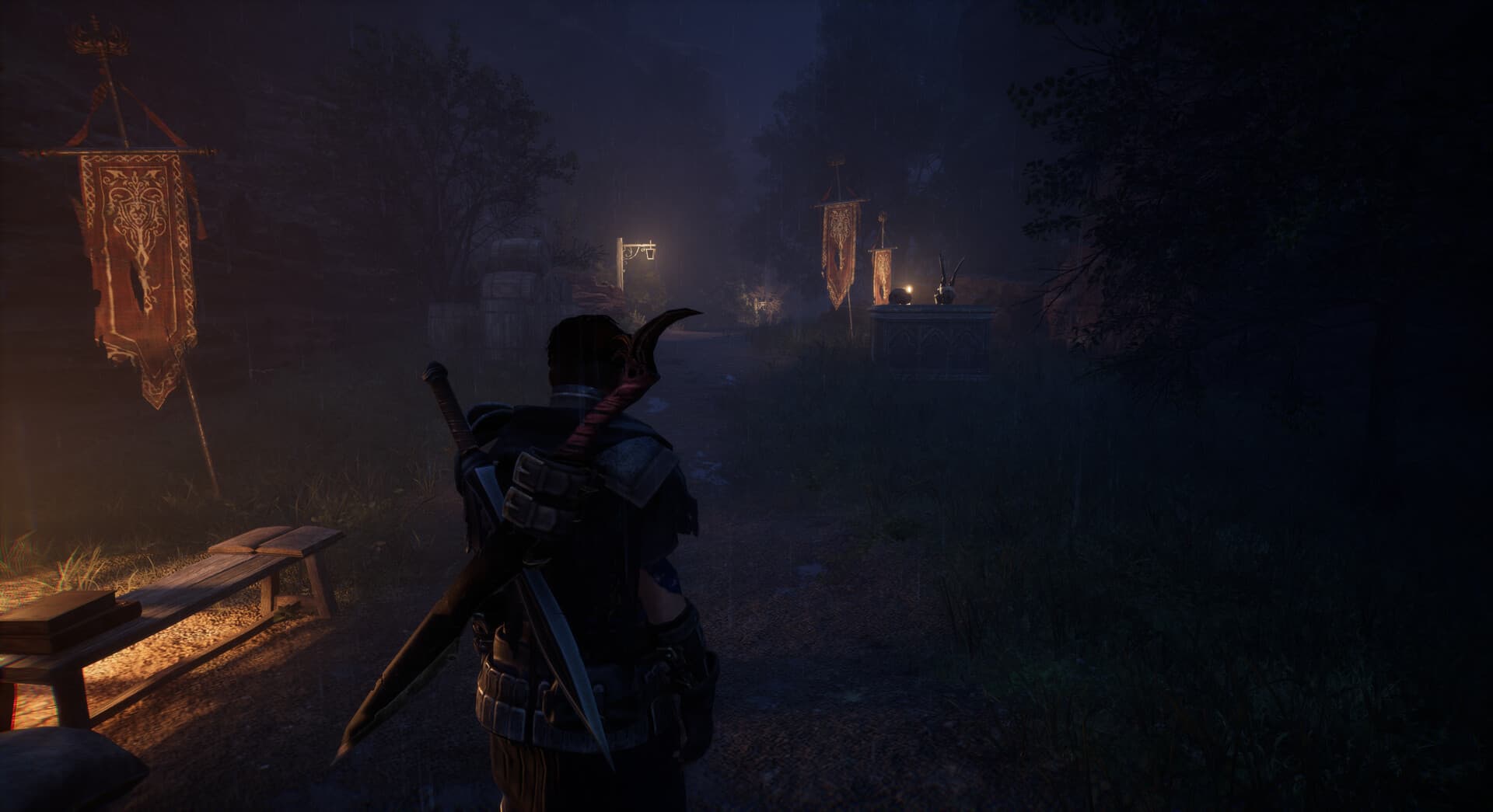 Perilous Nighttime Atmosphere: Immerse yourself in the eerie and haunting medieval night setting, with rain pouring down, casting ominous shadows on the abandoned ruins. The atmospheric audio design enhances the sense of danger and desperation as you search for an escape route.