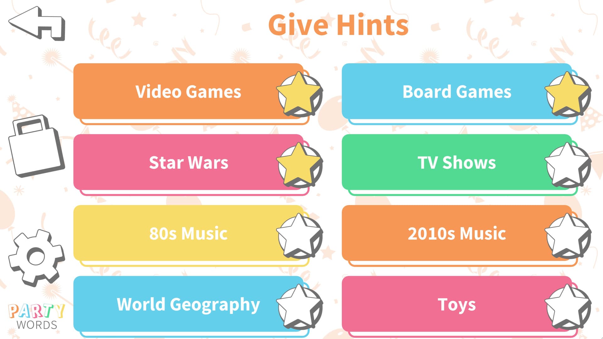 Party Words is a.... party word game. It combines a ton of decks covering people, places, categories, objects, and music, with a bunch of game modes like giving hints, answering prompts, and thinking on your feet for new ways to play!