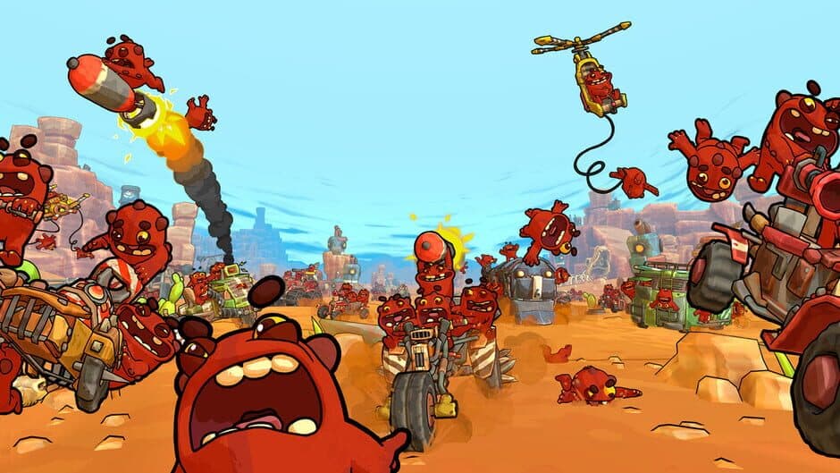 Set in a cartoon world, you shoot, block and dodge your way through hordes of hilarious enemies that drive and fly around in their clunky vehicles. Steal their scrap, upgrade your skills and build a weapon so insane it just might work! How far will you get?